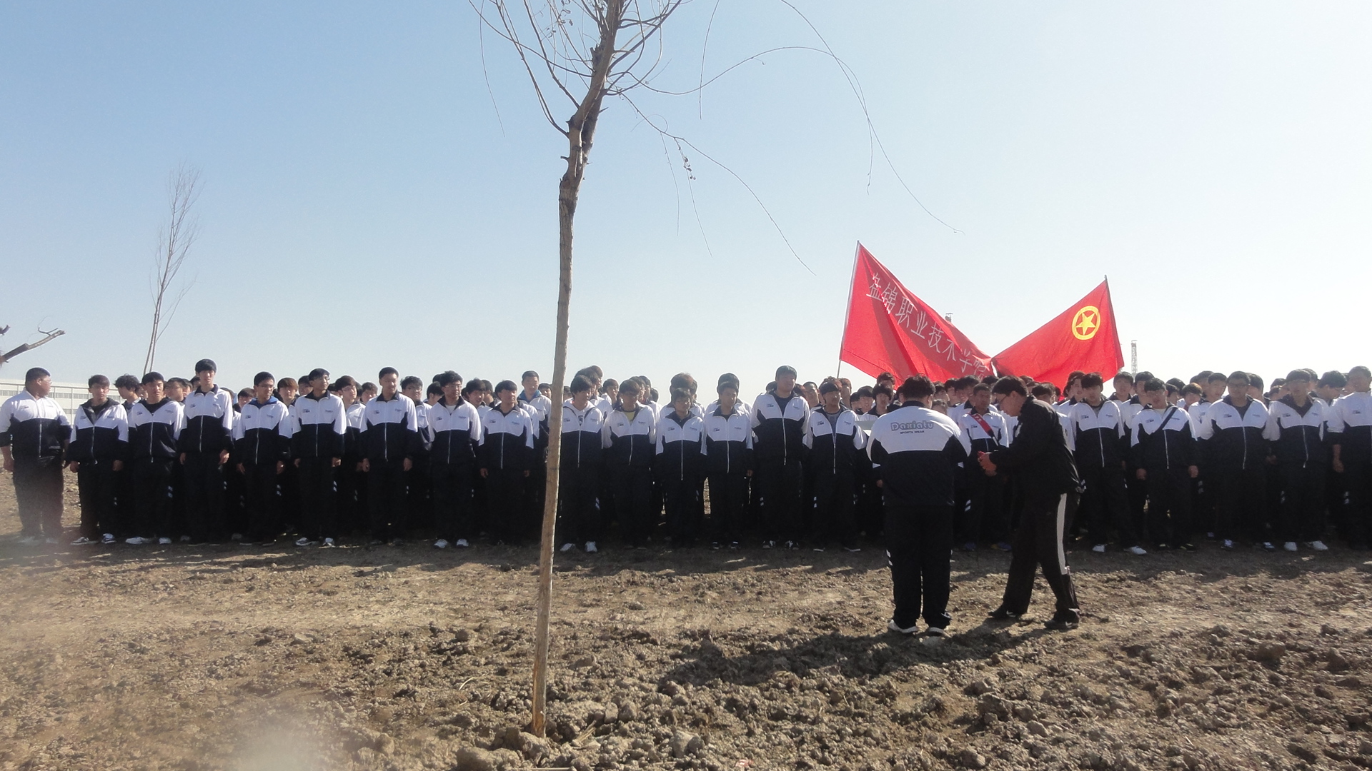 在植树前全体同学在系学生会主席金忠权带领下进行宣誓:为盘锦创建国家卫生城奉献出我们的力量。字字句句,振奋人心。