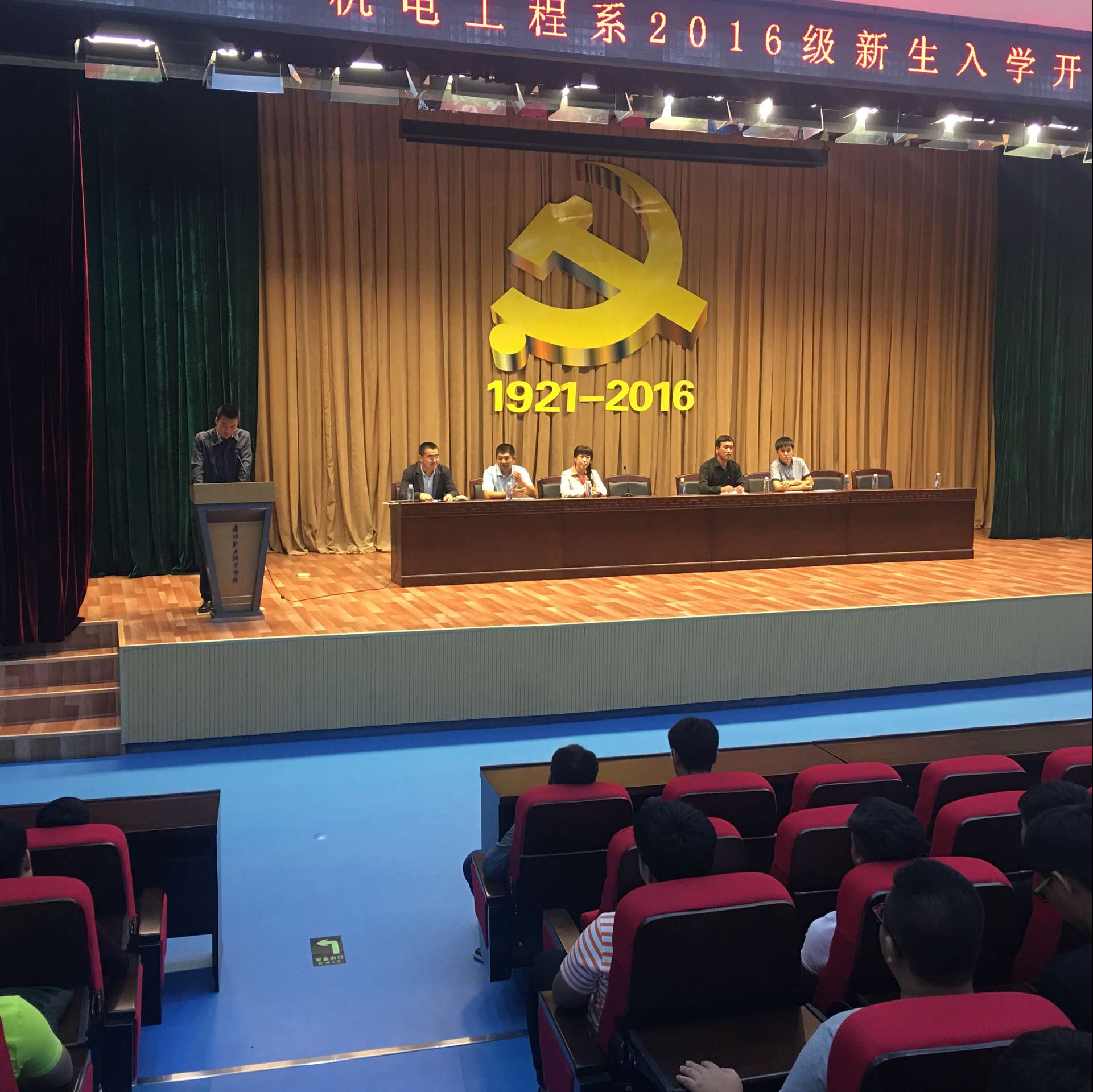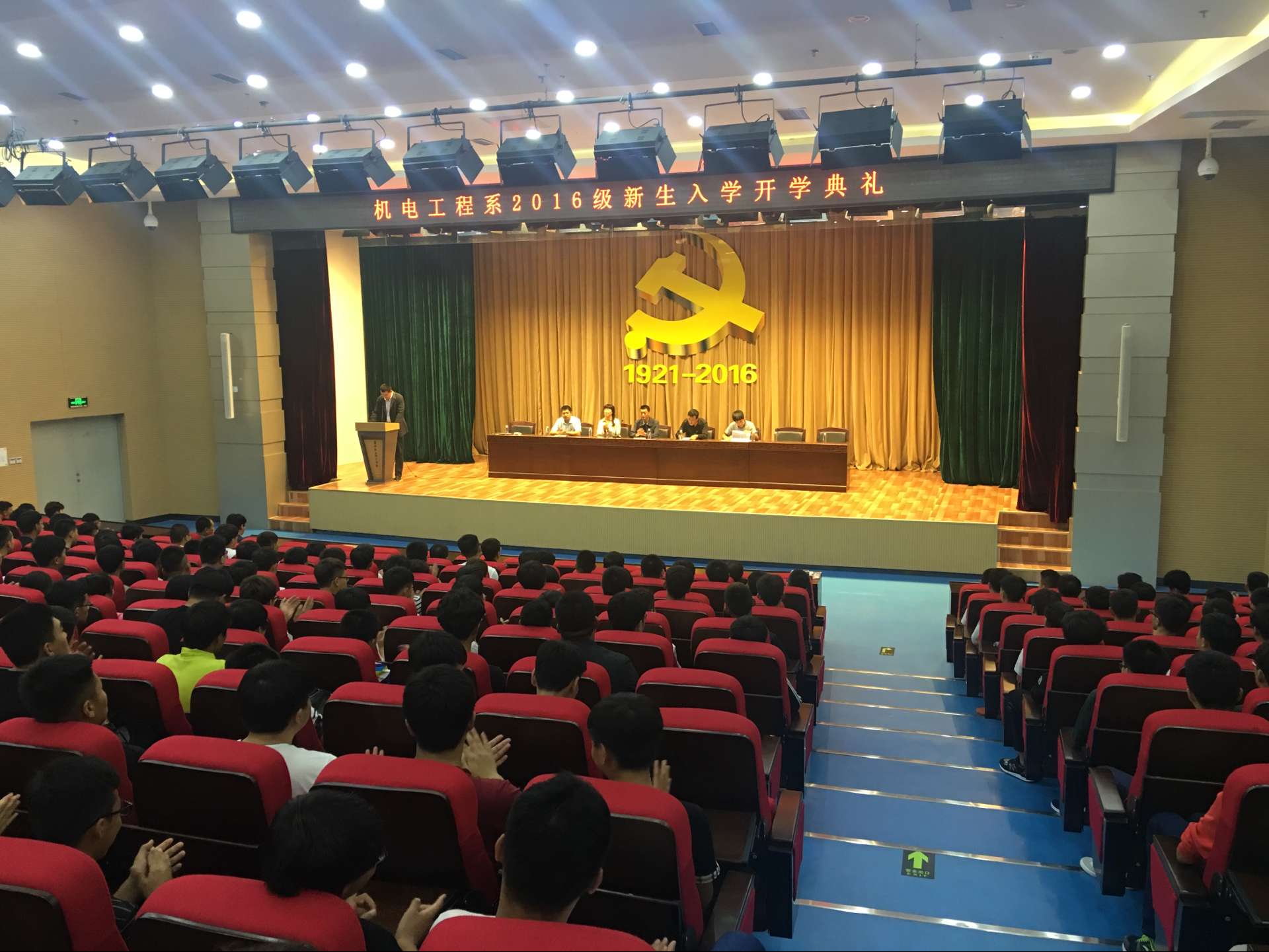 2016年9月2日,机电工程系在学院图书馆报告厅举行2016级新生开学典礼,机电工程系主任王辉、书记孙宏伟、实验与计算中心主任李树波、信息网络中心主任魏孔鹏、副主任孙伟、副书记王跃、教师杜文静教授,及各位新生班导师和三位辅导员参加,办公室主任张朝晶主持。