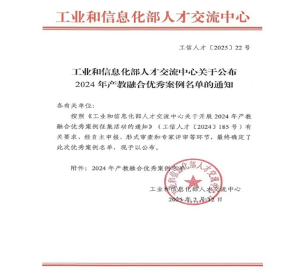 在产教融合深度推进的时代浪潮下,学院以市域产教联合体建设为基础,撰写的案例“新质生产力引领、产教双向赋能的市域产教联合体发展新路径”获得工业和信息化部人才交流中心2024年产教融合优秀案例。这一荣誉不仅是对世界杯体育官方网站产教融合工作的高度认可,更是学院在探索教育与产业协同创新发展道路上的一座重要里程碑。